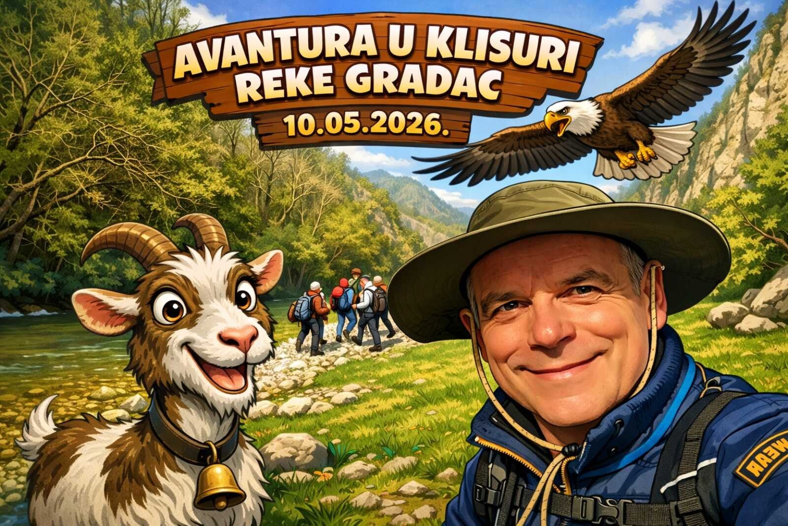 Prolećna avantura u klisuri reke Gradac. Obilazak manastira Ćelije, zatim šetnja uz reku do Šarenog platna, gde ćemo imati aktivnosti i takmičenja. Povratak i zadržavanje i etno restoranu pored reke SKOK PO SKOK.